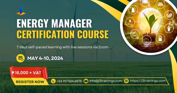 This 56-hour course is designed to improve knowledge and skills in work activities involving energy management, planning and supporting the implementation of regular energy audits, facilitating compliance with all relevant policies, and operating and maintaining energy-consuming machines and equipment in facilities. Course certificate is a requirement to apply for a Certified Energy Manager qualification with the Department of Energy (DOE).