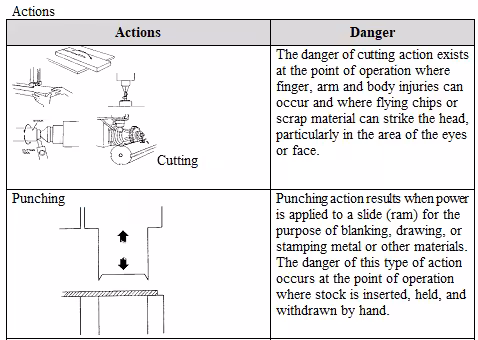 The basic types of hazardous mechanical motions are rotating, reciprocating and transversing while the basic actions are cutting, punching, shearing and bending.