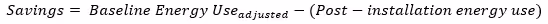 In principle, M&V simply quantifies energy savings by comparing consumption before and after the retrofit. The “before” case is defined as the “baseline performance”, and the “after” case is referred to as the post-installation period. In its simplest form,