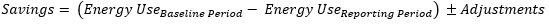 The baseline energy use must have sufficient data to accurately represent the energy performance before the project. The baseline performance is used to predict how much energy would have been used if the project had not been implemented. The reporting period energy use is subtracted from the baseline to determine the savings. The reporting period should be at least one operating cycle to fully capture the new energy performance. The Adjustments term represents routine and nonroutine adjustments to the energy performance. A routine adjustment would be energy consumption drivers that are expected to change, such as the weather. Non-routine adjustments are changes that do not usually occur, such as a change in facility size.